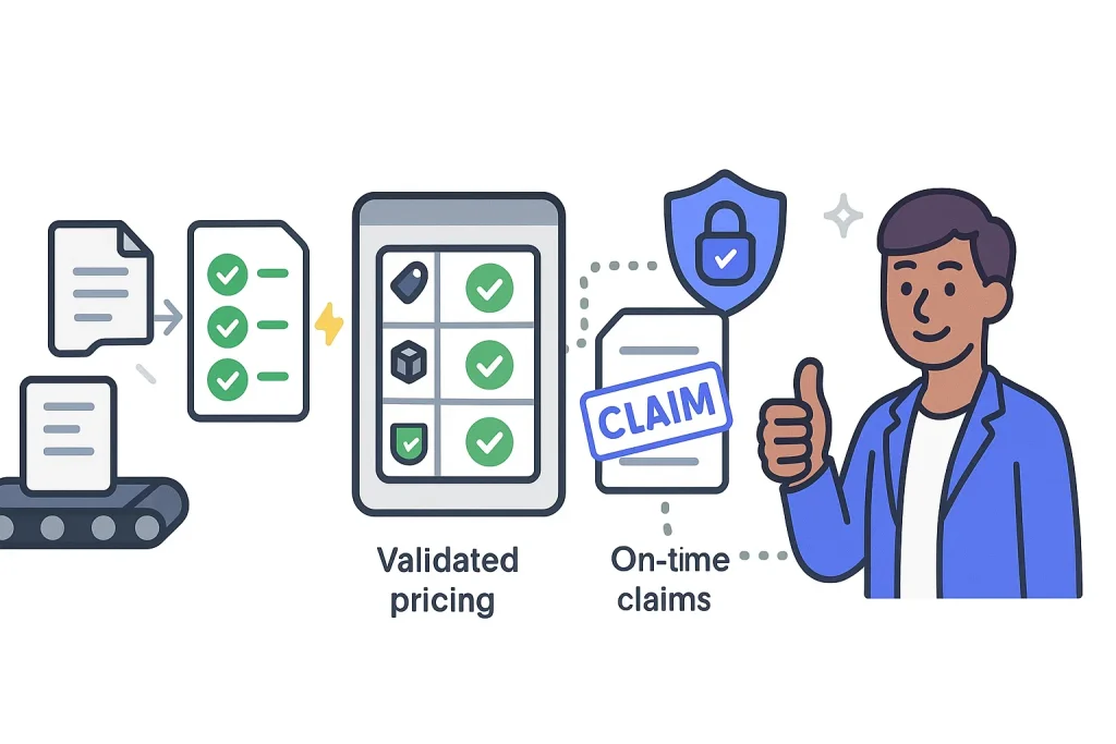 Map SKUs, UOM, pack/size, and program pricing to ERP/inventory. Exceptions flagged to Assessments.